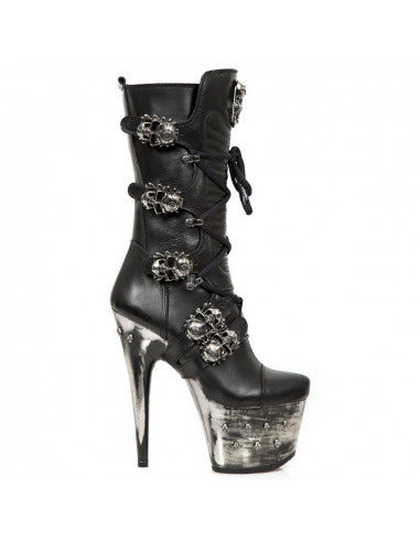 Hellraiser Stiletto Boot M-DEVIL001-S3 Leather Boot with Skull Buckles and Distressed Metallic Platform Heel