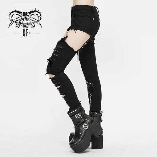 Punk Goth Asymmetrical Spliced Broken Hole Studded Women Pants with Chains